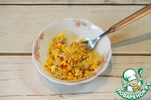 Яйца отварите, почистите, разрежьте вдоль пополам. Желток разомните вилкой.