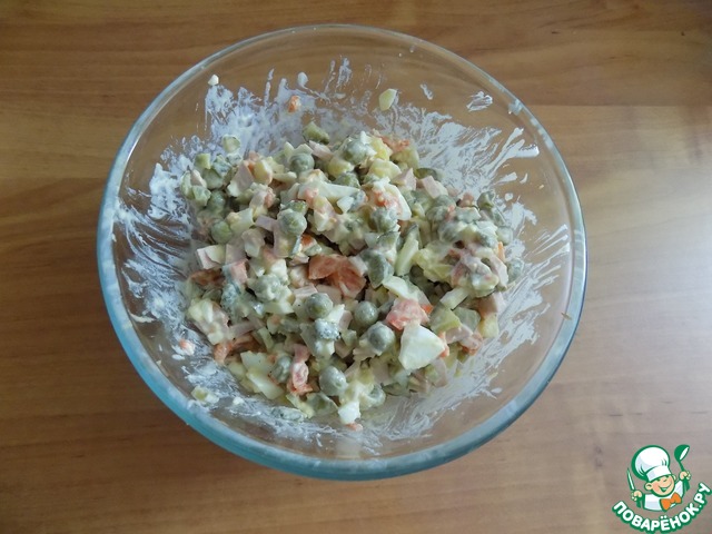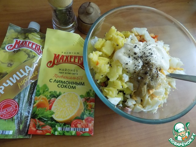 Пока застываем первый слой, делаем салат Оливье и заправляем его по вкусу. Майонеза и горчицы можно взять совсем мало, т к у нас будет первый слой заливного майонезно-горчичный. Можно поперчить. Я поперчила совсем мало, т к у меня желатин со специями, в состав которого входит в том числе и перец разный.
