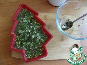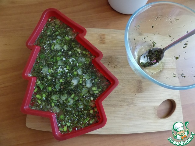 Первый слой застыл. Второй слой-зелень мелко рубленная и заливаем её бульоном с желатином.