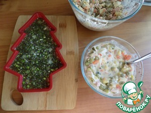 Когда зелень застынет, вынимаем форму из холодильника и выкладываем самый последний слой, а это Оливье, залитое бульоном с желатином и перемешанное.