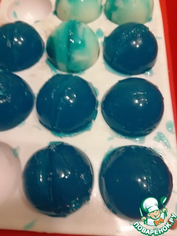 Разливаю желе в силиконовую форму с полусферами. К сожалению фото все время забываю делать. Но все просто - для шаров наливаю голубое желе, потом, сразу пока не застыло - белое.