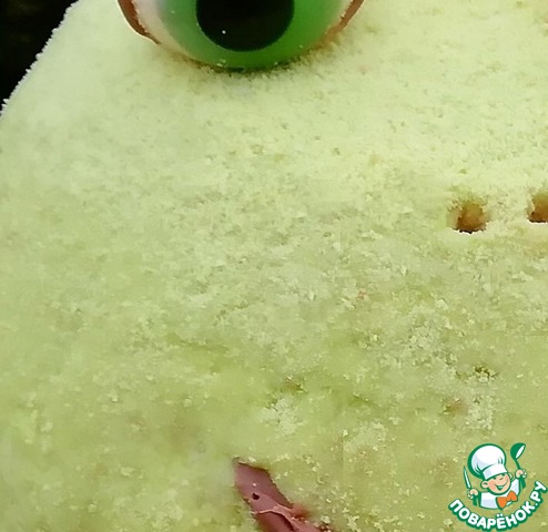 Для глаз нужно белое желе и немного зеленого. Еще отдельно отлила немного лимонного желе для черных зрачков (оно быстро застывает, поэтому лучше миску сначала прогреть кипятком) и добавила в него по капле синего и зеленого красителя, это очень много, поэтому когда ели торт эту краску я срезала. (Так, что я решила, на следующие глаза, для зрачков, буду использовать шоколадные капли). На донышко формы нужно капнуть черное желе, дать застыть, затем зеленое и опять отправить на 2-5 минут в холодильник и уже последним слоем молочное желе. Вторую половинку глаза делаю только из молочного желе.