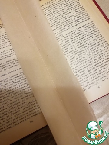 Если я просто провожу линию из шоколада, то у меня во первых, она всегда!!! получается неровной, во вторых она расплывается и в третьих легко ломается. Поэтому я и решила сделать для таких полосок форму - просто свернула в четыре раза кусок бумаги для выпечки, чтобы получить жесткий лист. Потом этот лист согнула и хорошо прижала по сгибу. Стыдно, но положила в книгу. Иначе не держится. И уже в этот сгиб выдавила шоколад. -