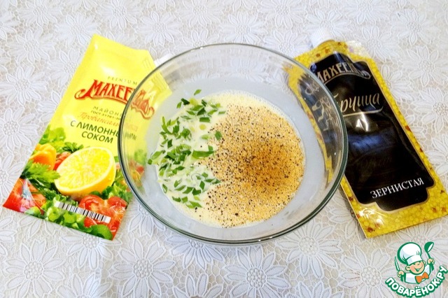 Приготовить соус для заливки. Распустить желатин в микро, чуть остудить, процедить через ситечко в пиалку. Добавить к нему майонез "МахеевЪ" Провансаль с лимонным соком и горчицу "МахеевЪ" зернистую, перемешать венчиком до однородности.