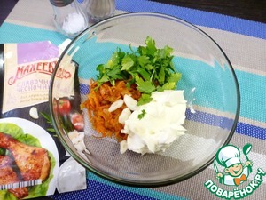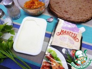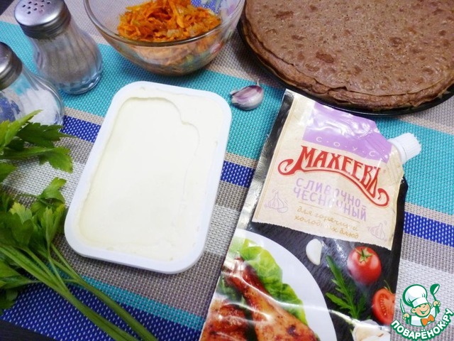 Пока остывают печеночные блинчики надо будет приготовить начинку. Понадобится сливочный сыр, чеснок, петрушка, сливочно чесночный соус ТМ МахеевЪ, зелень петрушки обжаренные лук с морковью.
