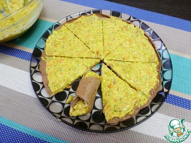 Разрезать блин на 8 частей и каждый скрутить рогаликом. Отправить закуску в холодильник для охлаждения.