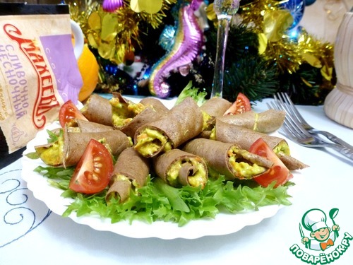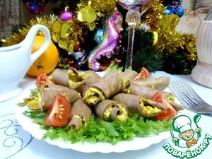 Очень вкусная и эффектная закуска на праздничный стол! Наверное, все мы готовили оладьи или блинчики из куриной печени. Немного пофантазировав с начинкой и оформлением, можно удивить гостей. Вот увидите, разберут в первую очередь. Счастливого Нового Года!