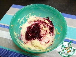 Вторую половину теста окрасить в малиновый цвет, добавив натертую на мелкой терке варёную свеклу.