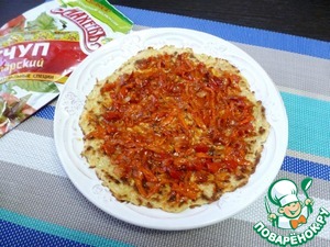 Приготовить овощную прослойку для закусочного торта. Для этого обжарить лук, морковь и сладкий перец до мягкости. В конце добавить Татарский кетчуп ТМ МахеевЪ, влить немного воды и протушить минуты 2. Посолить, поперчить и добавить сахар для вкусового баланса. Татарский кетчуп очень вкусный и ароматный, в нем много специй, он идеально подходит для прослойки.