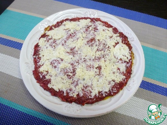 Для красных блинов приготовить белую прослойку из натертого сыра, чеснока и соуса Цезарь ТМ МахеевЪ.
