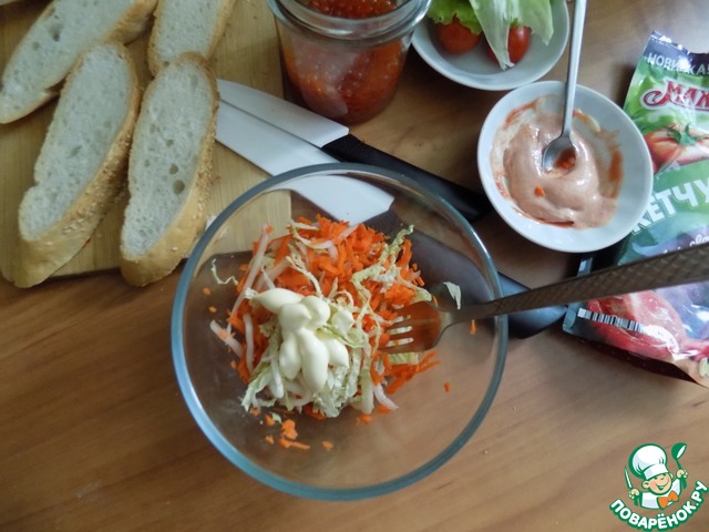 Всех лучше мне нравится для этой закуски использовать багет. Режем его наискосок, чтобы кусочки были подлинней. Багет можно подсушить на сухой сковороде или в тостере совсем немного. Делаем салат. Тонко режем пекинскую капусту и натираем морковь на средней тёрке. Добавляем очень мелко порезанные крабовые палочки (не обязательно). Заправляем майонезом по вкусу. Я совсем немного заправляю.