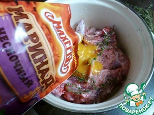 Кролика нарезать порционными кусками, мельчить не надо. Немного посолить, поперчить, добавить маринад Чесночный ТМ МахеевЪ, подожить 2 веточки чабреца. Перемешать и оставить на 40-50 минут мариноваться.