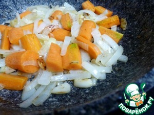 Почистить лук, морковку и чеснок. Лук нарезать четверть кольцами, а морковь крупными брусочками. Обжарить на той же сковороде до легкого золотистого цвета.