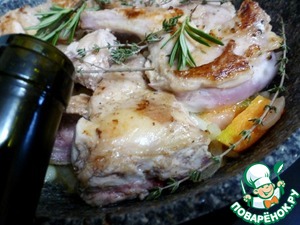 Вернуть в сковороду куски обжаренного кролика, добавитькусочки перца чили, чабрец и розмарин, влить белое сухое вино и готовить 5 минут, до выпаривания алкоголя.