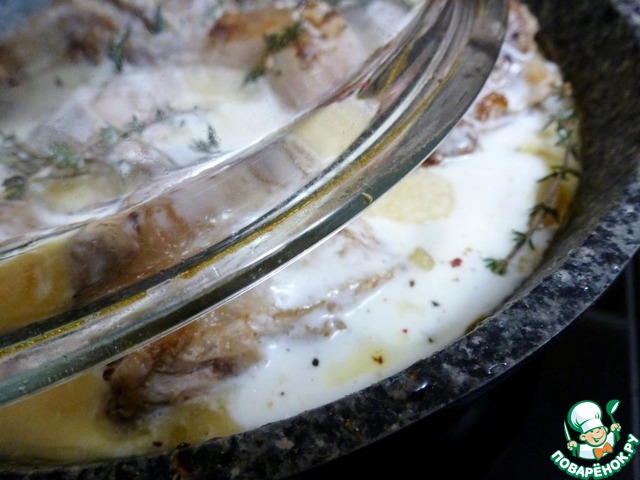 Залить кусочки кролика и овощи сметаной, довести до кипения, убавить огонь, закрыть крышкой и тушить минут 40-50. За 20 минут до окончания готовки положить 8-10 помидоров черри.