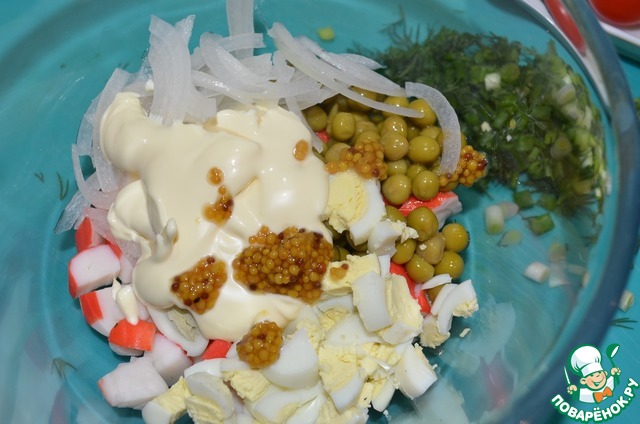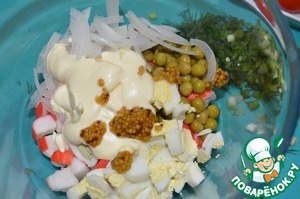 Посолить, заправить майонезом и горчицей.