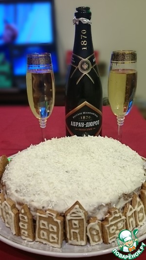 Украшением торта занималась дочь. У нас был новогодний торт. Поэтому она напекла имбирные печенья в форме домиков, нарисовала белым шоколадом окошки, снег над городом сделали из тертого белого шоколада