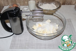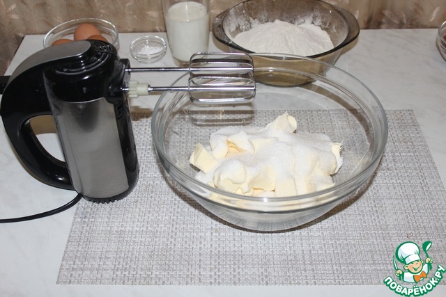 Масло взбиваем с сахаром до полного растворения сахара 5-7 минут.