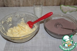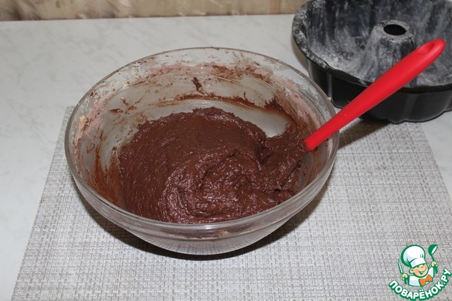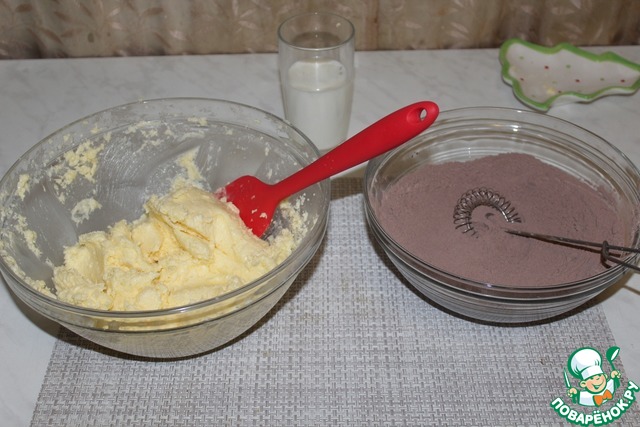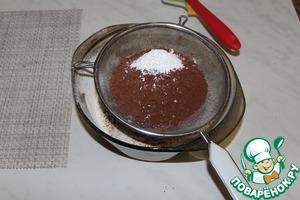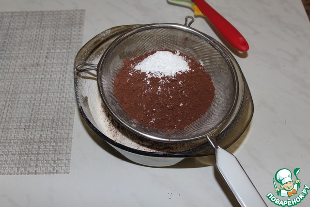 В муку просеиваем какао и разрыхлитель. Хорошо все перемешиваем.