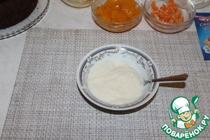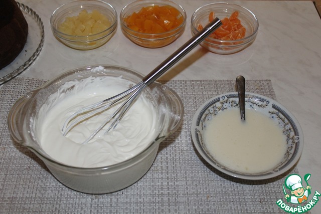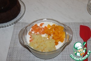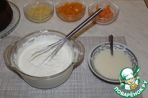 В сметанное желе добавляем фрукты по желанию. Перемешиваем.