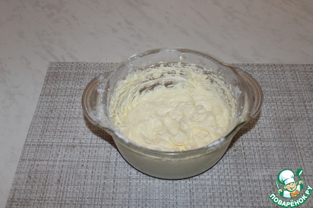 Готовим крем чиз. Взбиваем творожный сыр, сахарную пудру и сливочное масло до пышности.