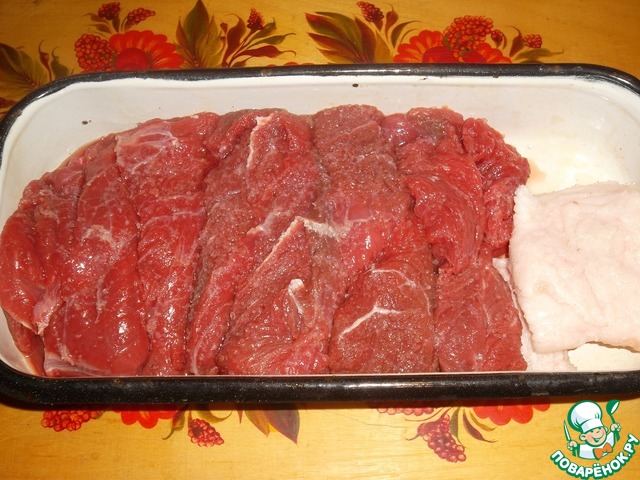 Мясо и сало промываем и обсушиваем. С сала снимаем шкуру, говядину зачищаем. Режем крупными кусками...