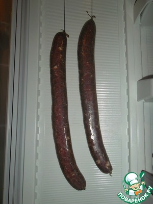 Вывешиваем на дверцу холодильника на 4-5 дней, потом опять кладем на 3 дня под пресс, затем опять на дверцу – до готовности. После второй отпрессовки у меня колбаса висела почти три недели, а точнее – 19 дней…