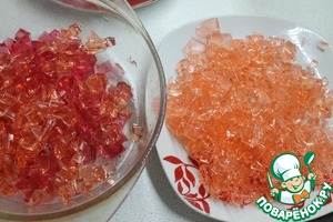 • Приготовить желе по инструкции, но воды взять в два раза меньше. Вылить желе в плоскую форму, высотой около одного сантиметра и поставить застывать.