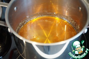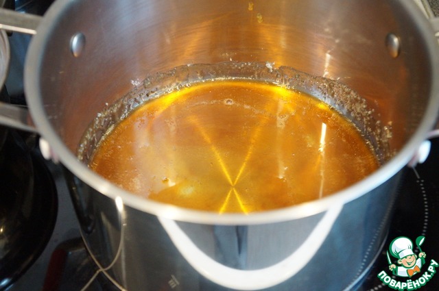 Сахар растопить в кастрюле с толстым дном. Важно не пережечь, а снять с огня когда у карамели будет светлый золотистый цвет.