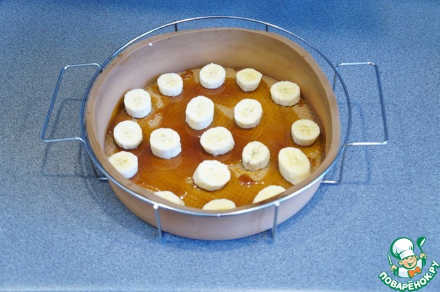 Вылить карамель в форму, сверху разложить кусочки 2 бананов.