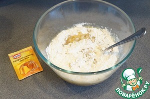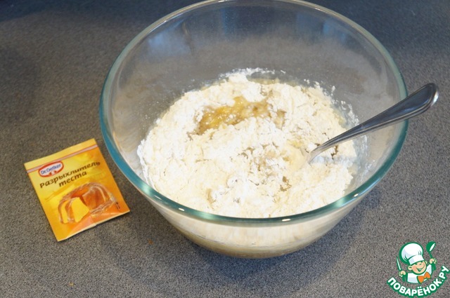 Всыпать рубленные орехи и заранее замоченный в горячей воде изюм (воду слить). Добавить оба вида муки, разрыхлитель.