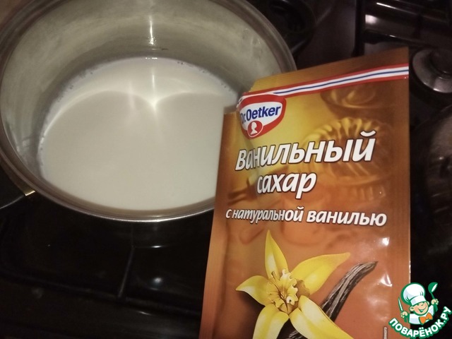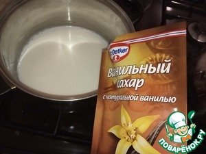Молоко вскипятить с ванилью и 100 гр. сахарного писка. Оставшиеся 100 гр. сахара перемешать с мукой. Половину закипевшего молока заливаем в мисочку с мукой и сахаром и переливаем обратно в кастрюлю с молоком, хорошо помешивая провариваем до загустения крема.