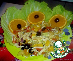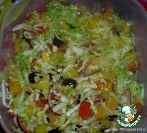 Апельсин очищаем от пленок и режем небольшими кусочками. Добавляем в салат.