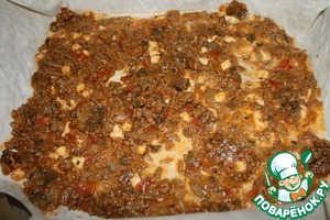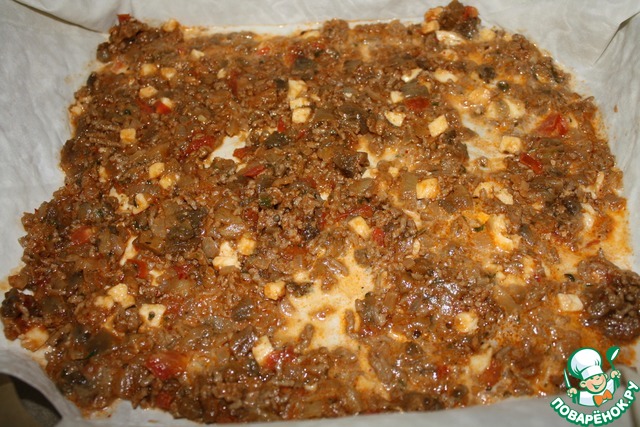 Выкладываем первый лист теста, края свисают по бортам, и их не трогать. Наливаем чуть заливку и выкладываем половину начинки. Накрываем следующим листом теста, я его просто нарываю на куски.