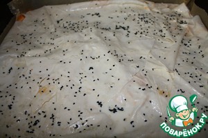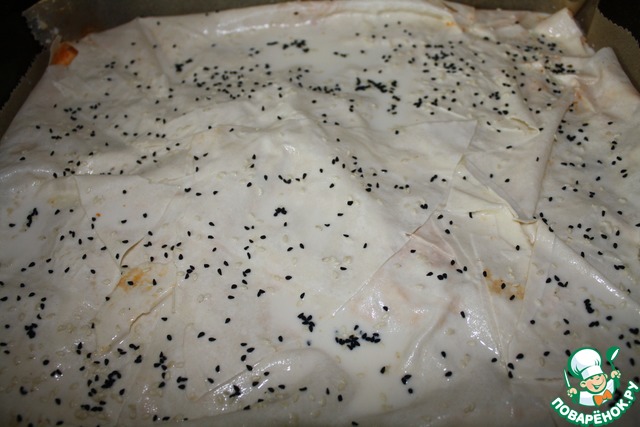 Смазать верх маслом растительным, полить заливкой и посыпать кунжутом.
