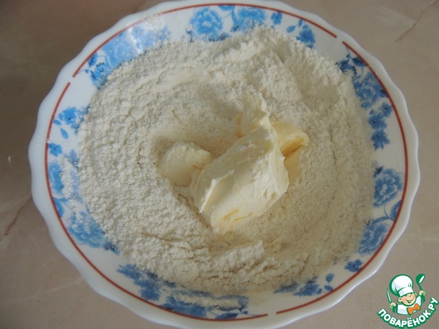 Для этого в посуде соединить муку 120 г, сахар 40 г, ванильный сахар 1 ст. л., сливочное масло 70 г., 3 ст. л. сливок. Замесить мягкое эластичное тесто. -