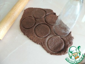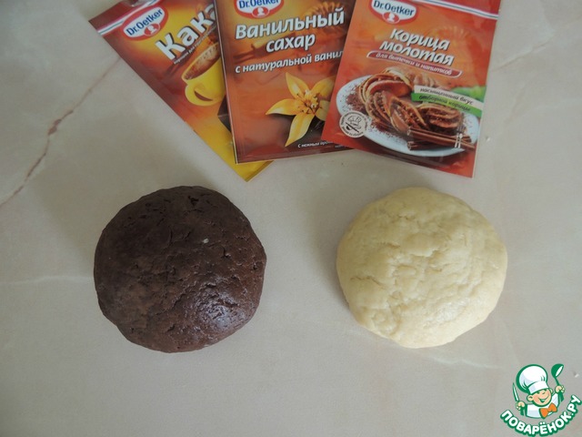 Вначале приготовим шоколадное тесто. Для этого в отдельной посуде соединить 100 г. муки, какао-порошок, корицу молотую, сахар 40 г., ванильный сахар 1 с. л., сливочное масло 70 г., 3 ст. л. сливок. Замесить мягкое эластичное тесто. Если тесто получится жидковатым, то добавить чуть муки. Если наоборот, то добавьте сливки.
