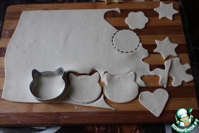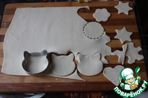 Тесто разморозьте и раскатайте. Вырежьте формочками для печенья парные фигурки.