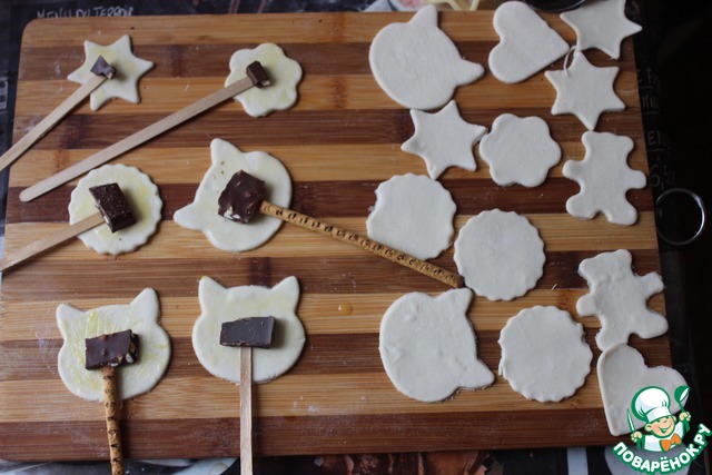 Половину смажьте желтком, положите палочки от мороженого или деревянные шпажки. Сверху – по дольке шоколада (у меня с орехами). Можно добавить ягоды чёрной смородины.