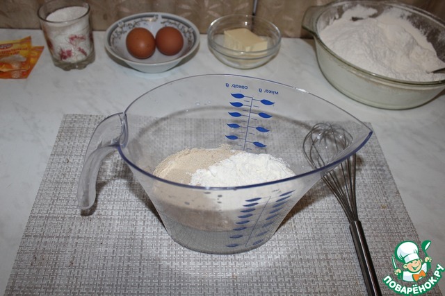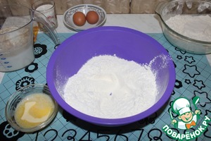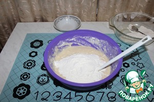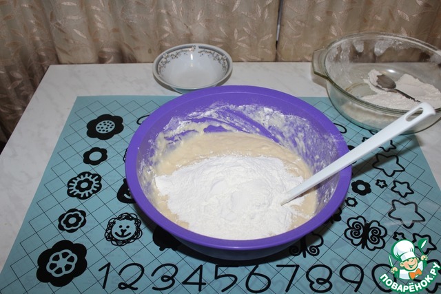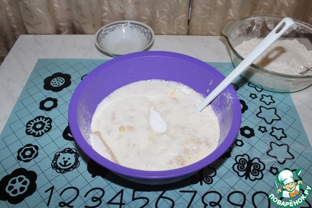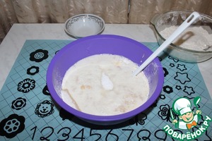 • В молоко добавляем дрожжи, 2 ст л муки и 1 ст л сахара. Хорошо перемешиваем. Оставляем в теплом месте для подъема.