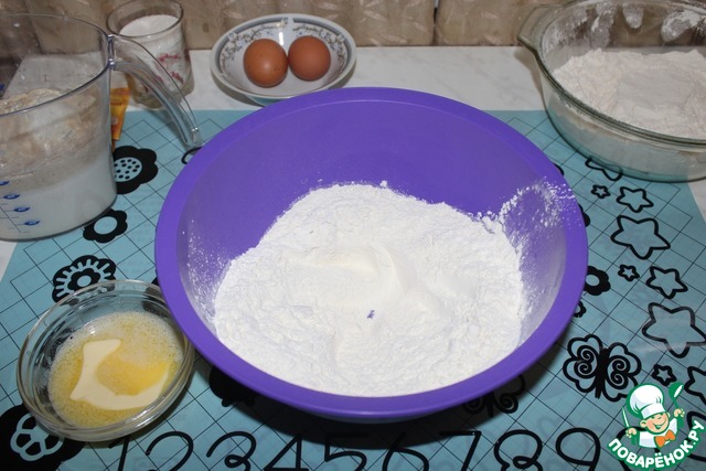 • Добавляем опару, растопленное сливочное масло, яйца, сахар и ванильный сахар.