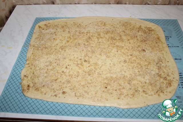 • Раскатываем тесто в пласт толщиной 3 мм. Смазываем растопленным сливочным маслом. Сверху посыпаем орехами.