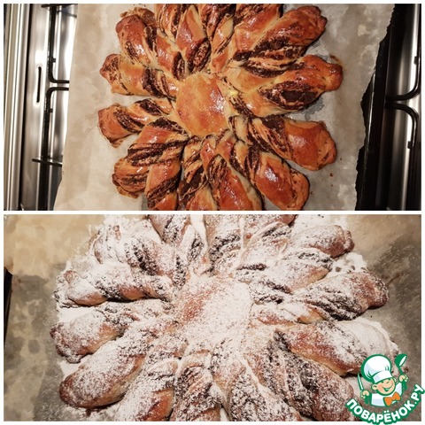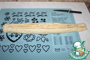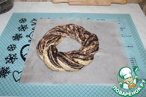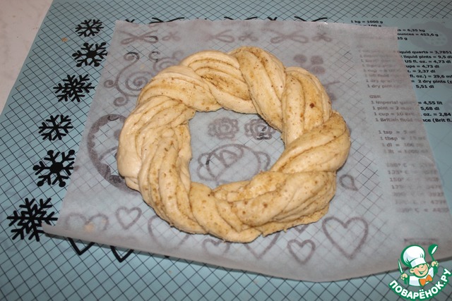 • Скручиваем в жгут и формируем калач. Даем подойти 15-20 минут. Смазываем желтком и выпекаем при 180 градусах 30-35 минут.