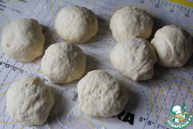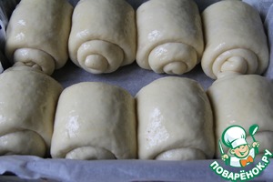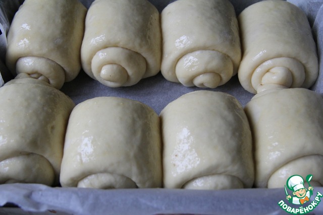 Все булочки уложить в форму для выпечки и оставить в теплом месте для расстойки до увеличения булочек в объеме (минут на 40-60), накрыв их кухонным полотенцем.