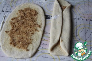 Каждый шарик раскатывать в овал. Смазать растопленным сливочным маслом, посыпать начинкой и завернуть края внутрь "внахлест" и прокатать скалкой.