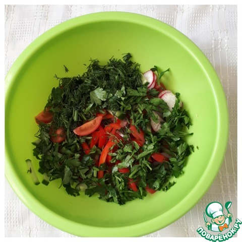 Складываем нарезанные овощи в чашку и добавляем измельченные укроп и петрушку, листья салата.