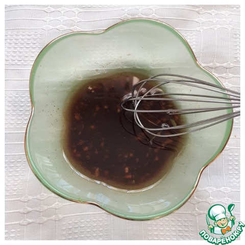 Готовим вкусную заправку. Смешиваем соевый соус, гранатовый соус, добавляем растительное масло, кунжутное масло, раздавленный чеснок, щепотку красного перца и все хорошо перемешиваем.