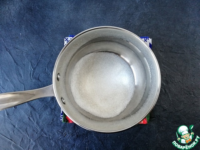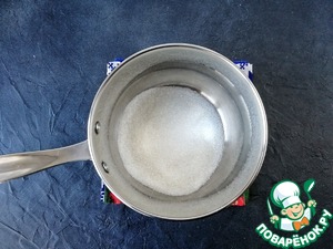 В сотейник с толстым дном высыпаем весь сахар и ставим на средний огонь. Воды не добавляем! Ничем не мешаем! Можно только покачивать сотейник из стороны в сторону.