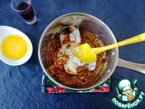 Начинает всё прыгать и плясать, но это нормально! Возвращаем сотейник на небольшой огонь и, постоянно мешая, ждём, когда сливочно-творожный сыр полностью растворится. Получается вот такая масса.