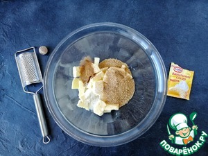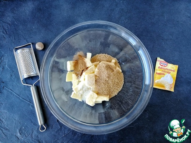 В удобной большой чаше соединяем мягкое сливочное масло (его лучше достать из холодильника за пару часов до готовки, пусть погреется), коричневый сахар, корицу, ванильный сахар "Dr. Oetker", щепотку соли и натёртый мускатный орех.
